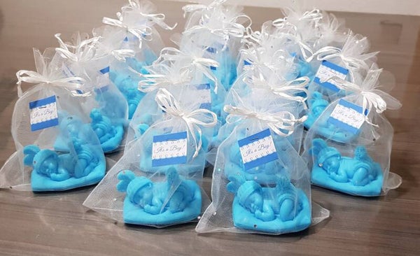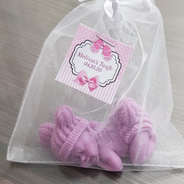 Die Gastgeschenke werden in einem Tüll eingepackt und mit einem Kärtchen versehen.